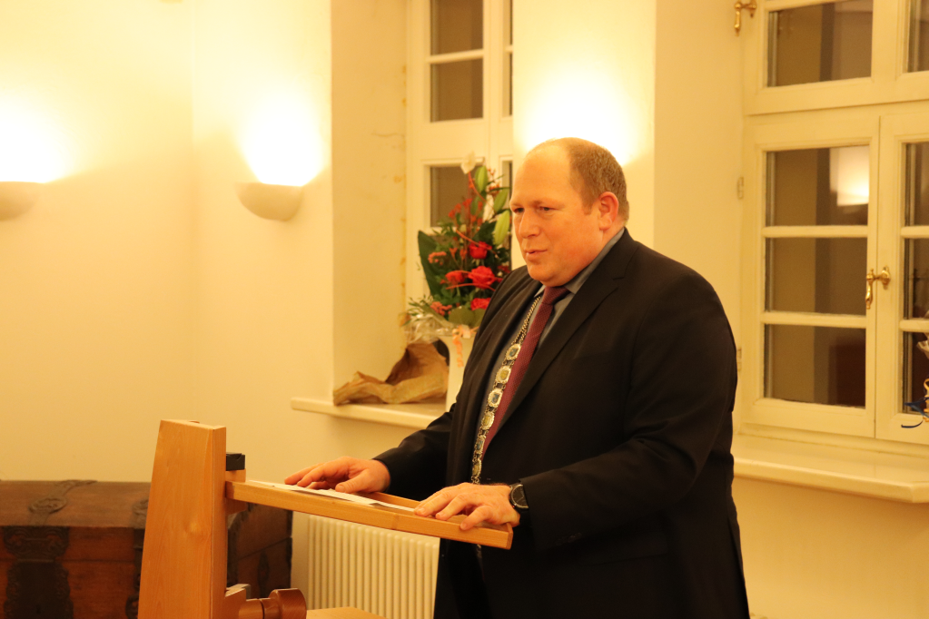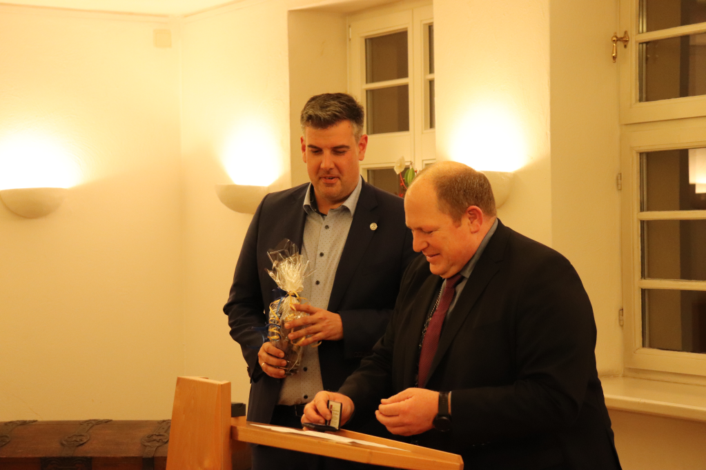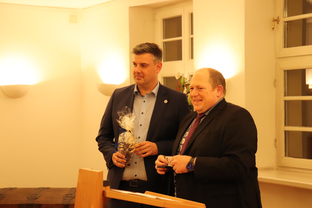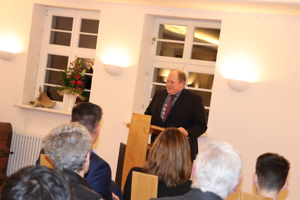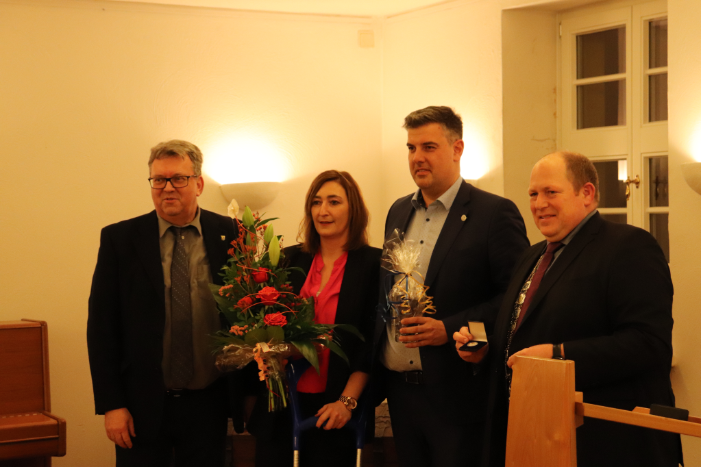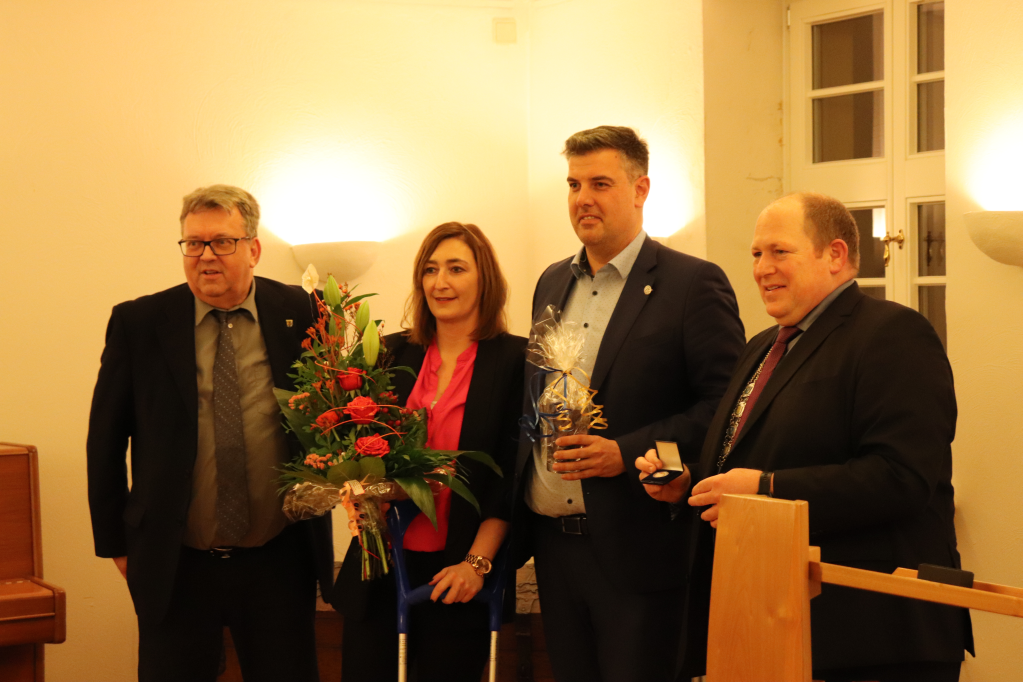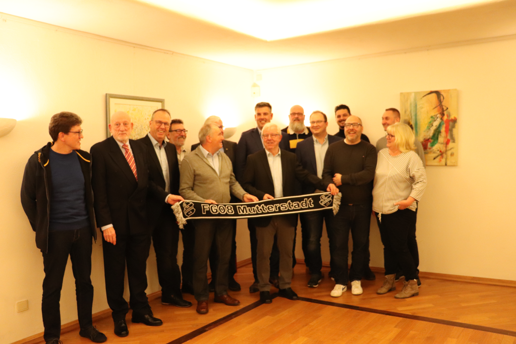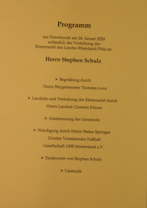 Gestern Abend erhielt Stephen Schulz im Historischen Rathaus die Ehrennadel des Landes Rheinland Pfalz und die Silber Medaille der Gemeinde Mutterstadt für sein außerordentliches ehrenamtliches Engagement. Geladen waren Gäste aus dem Bereich Politik, Sport und Wirtschaft. Auch seine Familie, Eltern und sein Bruder waren gekommen um an der Ehrung teilzunehmen. Zu aller erst begrüßte Bürgermeister Thorsten Lewa die hier Anwesenden. Die Laudatio und die Verleihung übernahm Landrat Clemens Körner mit dem Bundestagsabgeordneten Christian Schreider der unter anderem Vertreter der Vereine im Präsidium beim SWFV ist. Landrat Clemens Körner überreichte Stephen Schulz Ehefrau Tanja einen Blumenstrauß, dafür das sie Ihm immer ihren Ehemann den Rücken freihält wenn es was für die Nullachter zu tun gäbe. Danach erhielt Stephen Schulz von Herrn Bürgermeister Thorsten Lewa die Silber Medaille der Gemeinde Mutterstadt. Als nächster trat Stefan Springer ans Rednerpult und bedankte sich im Namen der FG 08 Mutterstadt für das Engagement von Stephen Schulz bei den Nullachter mit ein paar Anekdoten u.a. aus seiner aktiven Zeit, mit einem Vergleich des vor kurzen verstorbenen Franz Beckenbauer, die aber nicht stand hielt, da die Spielweise des Stephen Schulz doch eine andere war. In allen Reden wurde sein außerordentliches ehrenamtliches Engagement in so jungen Jahren hervorgehoben. Dies sollte ein Anreiz für alle sein sich ehrenamtlich zu engagieren (Anmerkung der Redaktion)
