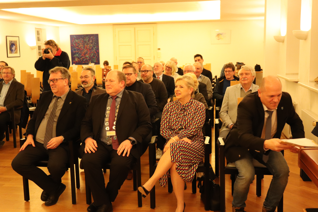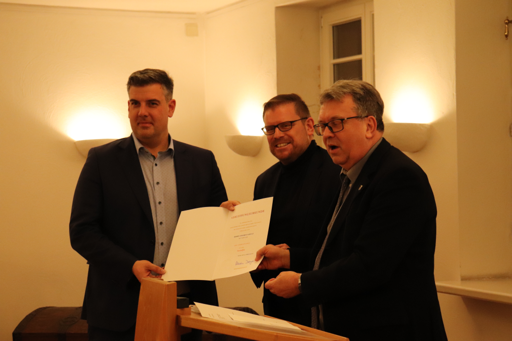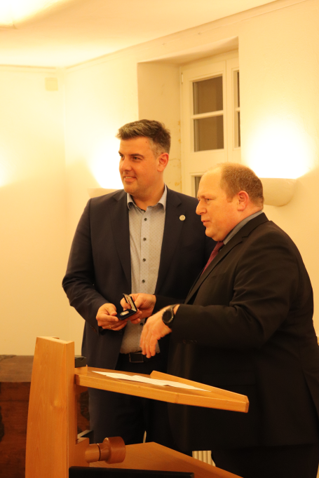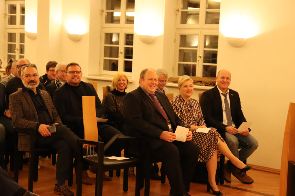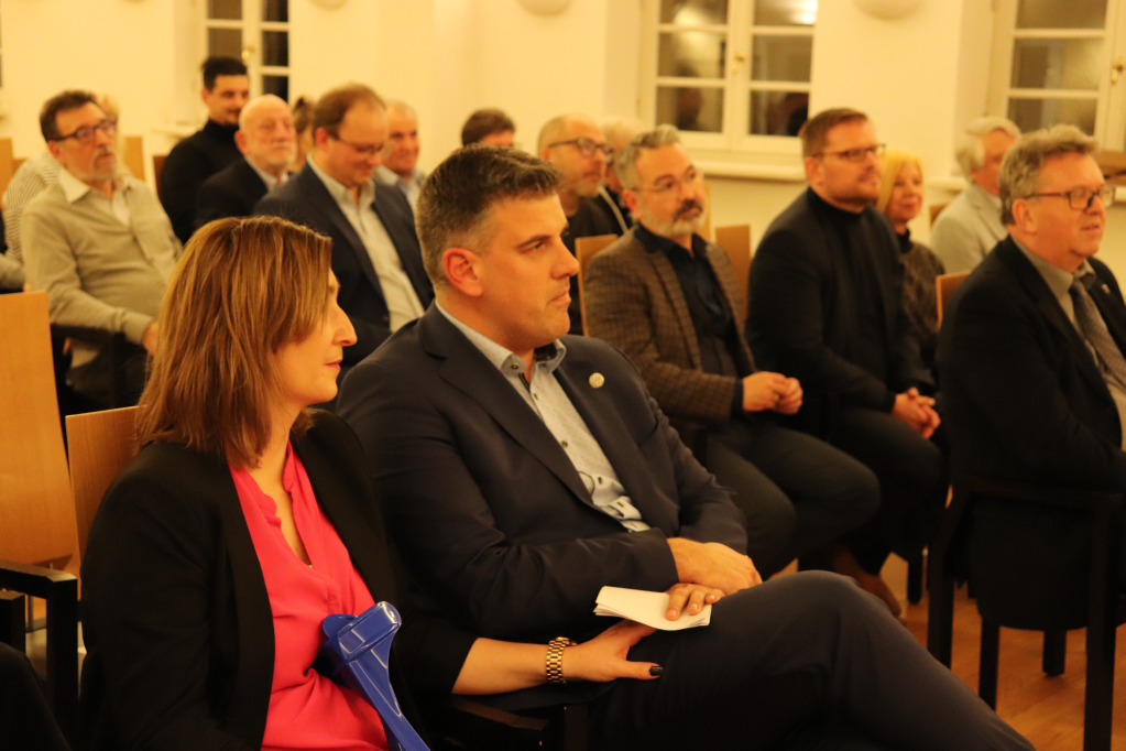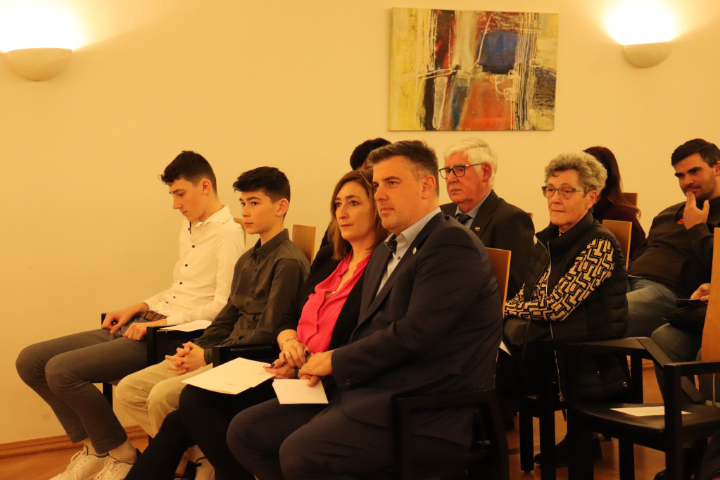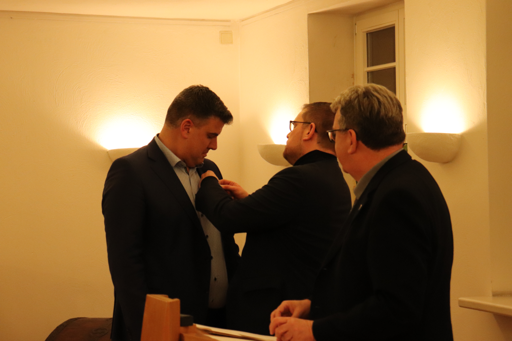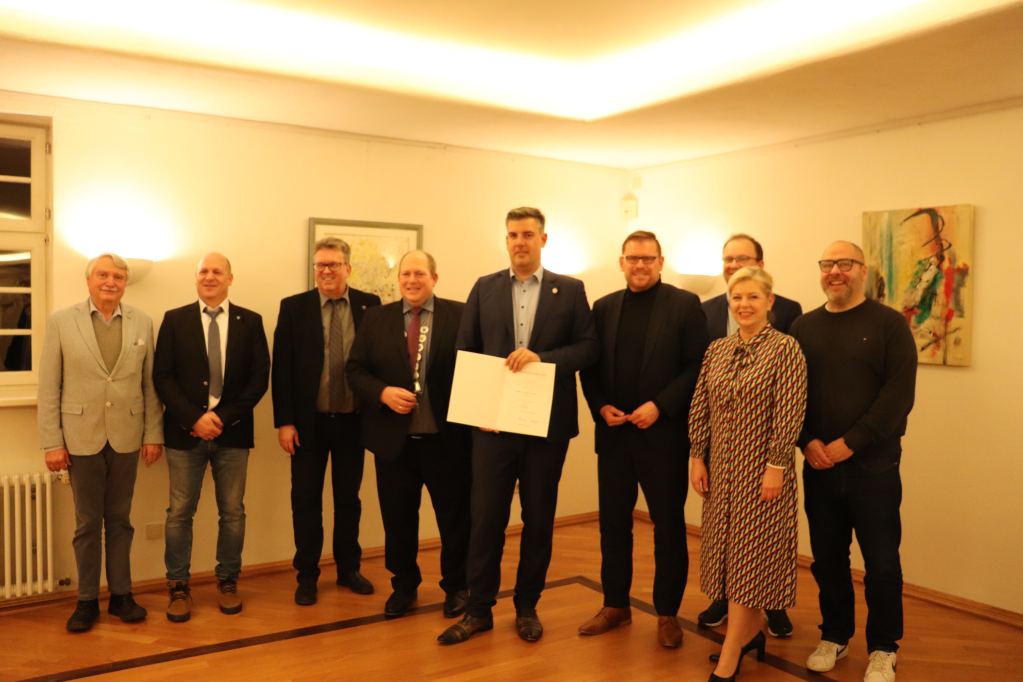 Gestern Abend erhielt Stephen Schulz im Historischen Rathaus die Ehrennadel des Landes Rheinland Pfalz und die Silber Medaille der Gemeinde Mutterstadt für sein außerordentliches ehrenamtliches Engagement. Geladen waren Gäste aus dem Bereich Politik, Sport und Wirtschaft. Auch seine Familie, Eltern und sein Bruder waren gekommen um an der Ehrung teilzunehmen. Zu aller erst begrüßte Bürgermeister Thorsten Lewa die hier Anwesenden. Die Laudatio und die Verleihung übernahm Landrat Clemens Körner mit dem Bundestagsabgeordneten Christian Schreider der unter anderem Vertreter der Vereine im Präsidium beim SWFV ist. Landrat Clemens Körner überreichte Stephen Schulz Ehefrau Tanja einen Blumenstrauß, dafür das sie Ihm immer ihren Ehemann den Rücken freihält wenn es was für die Nullachter zu tun gäbe. Danach erhielt Stephen Schulz von Herrn Bürgermeister Thorsten Lewa die Silber Medaille der Gemeinde Mutterstadt. Als nächster trat Stefan Springer ans Rednerpult und bedankte sich im Namen der FG 08 Mutterstadt für das Engagement von Stephen Schulz bei den Nullachter mit ein paar Anekdoten u.a. aus seiner aktiven Zeit, mit einem Vergleich des vor kurzen verstorbenen Franz Beckenbauer, die aber nicht stand hielt, da die Spielweise des Stephen Schulz doch eine andere war. In allen Reden wurde sein außerordentliches ehrenamtliches Engagement in so jungen Jahren hervorgehoben. Dies sollte ein Anreiz für alle sein sich ehrenamtlich zu engagieren (Anmerkung der Redaktion)