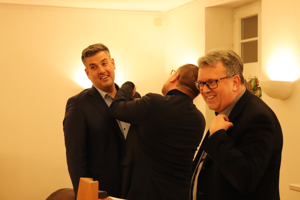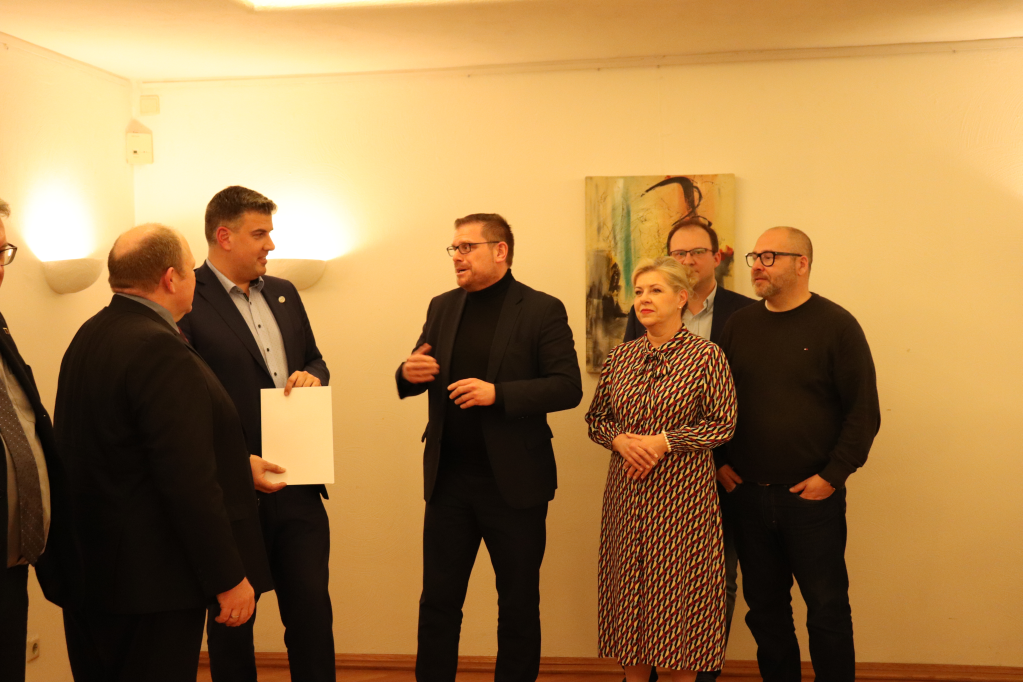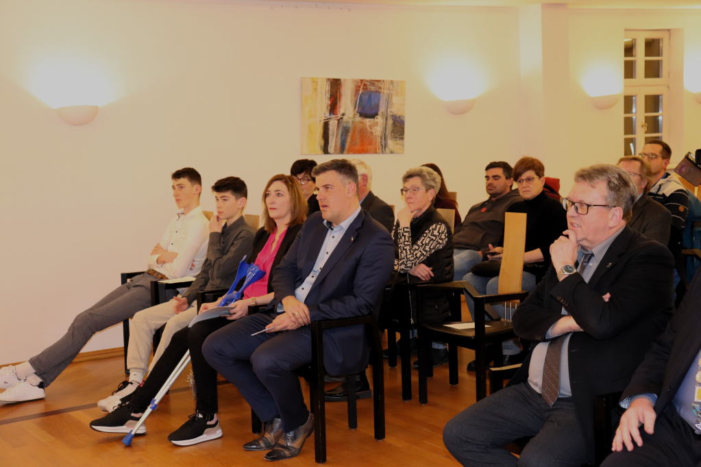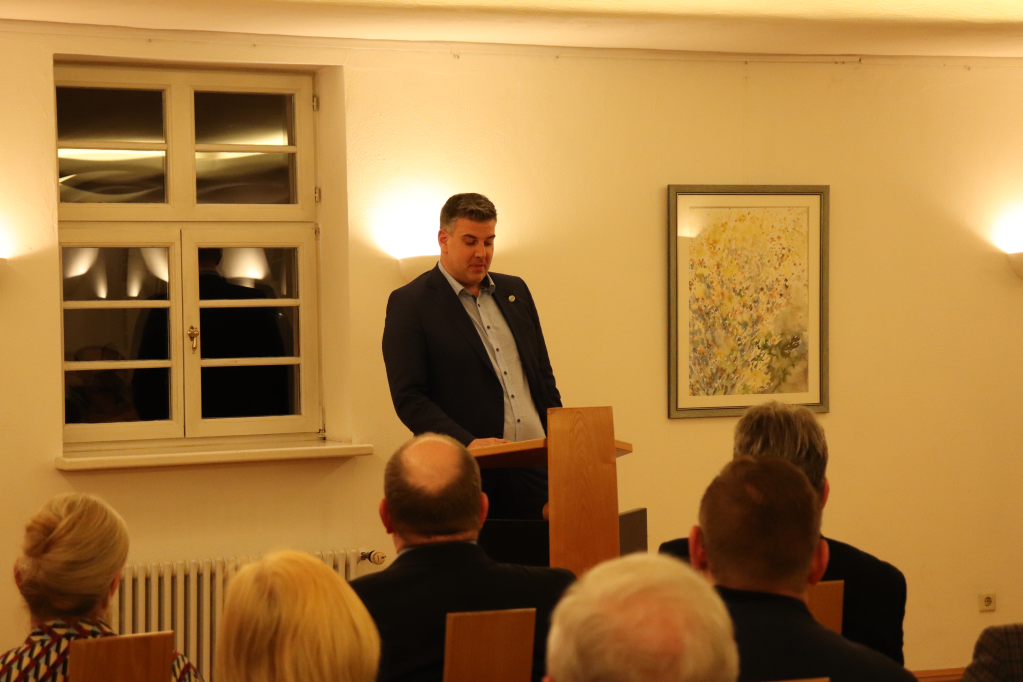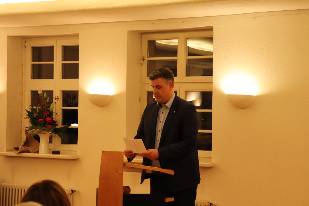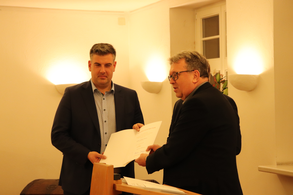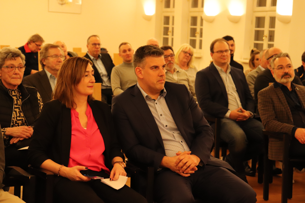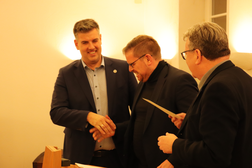 Gestern Abend erhielt Stephen Schulz im Historischen Rathaus die Ehrennadel des Landes Rheinland Pfalz und die Silber Medaille der Gemeinde Mutterstadt für sein außerordentliches ehrenamtliches Engagement. Geladen waren Gäste aus dem Bereich Politik, Sport und Wirtschaft. Auch seine Familie, Eltern und sein Bruder waren gekommen um an der Ehrung teilzunehmen. Zu aller erst begrüßte Bürgermeister Thorsten Lewa die hier Anwesenden. Die Laudatio und die Verleihung übernahm Landrat Clemens Körner mit dem Bundestagsabgeordneten Christian Schreider der unter anderem Vertreter der Vereine im Präsidium beim SWFV ist. Landrat Clemens Körner überreichte Stephen Schulz Ehefrau Tanja einen Blumenstrauß, dafür das sie Ihm immer ihren Ehemann den Rücken freihält wenn es was für die Nullachter zu tun gäbe. Danach erhielt Stephen Schulz von Herrn Bürgermeister Thorsten Lewa die Silber Medaille der Gemeinde Mutterstadt. Als nächster trat Stefan Springer ans Rednerpult und bedankte sich im Namen der FG 08 Mutterstadt für das Engagement von Stephen Schulz bei den Nullachter mit ein paar Anekdoten u.a. aus seiner aktiven Zeit, mit einem Vergleich des vor kurzen verstorbenen Franz Beckenbauer, die aber nicht stand hielt, da die Spielweise des Stephen Schulz doch eine andere war. In allen Reden wurde sein außerordentliches ehrenamtliches Engagement in so jungen Jahren hervorgehoben. Dies sollte ein Anreiz für alle sein sich ehrenamtlich zu engagieren (Anmerkung der Redaktion)
