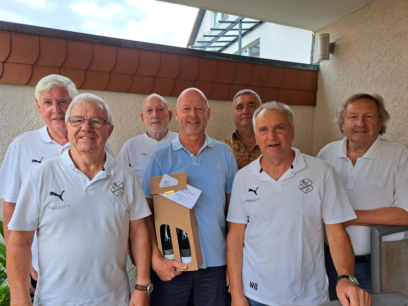 Jürgen begann in der Jugend des SV Südwest Ludwigshafen mit dem Fußball spielen. Erst nach einer Pause und dem Umzug nach Mutterstadt begann er wieder dem runden Leder hinterher zu jagen. Im Jahr 1994 trat er unserer FG 08 Mutterstadt bei und konnte 2019 sein 25-jähriges Vereinsjubiläum feiern. Seit Beginn spielt er in der AH-Mannschaft, deren Spielleiter er jahrelang war. Noch heute ist er in der Ü 50 AH-Mannschaft am Ball. Bei den Vereinsaktivitäten wie Waldfest oder Oktoberfest ist Jürgen ein immer gern gesehener Helfer und Unterstützer. Da der Ältestenrat am Montag, 25. August 2025 Kerwe-Dienst leisten musste, konnte er  erst am Donnerstag, 28. August die besten Glückwünsche der FG 08 Mutterstadt, mit  einem Weinpräsent, überbringen. Weiterhin alles Gute, lieber Jürgen!