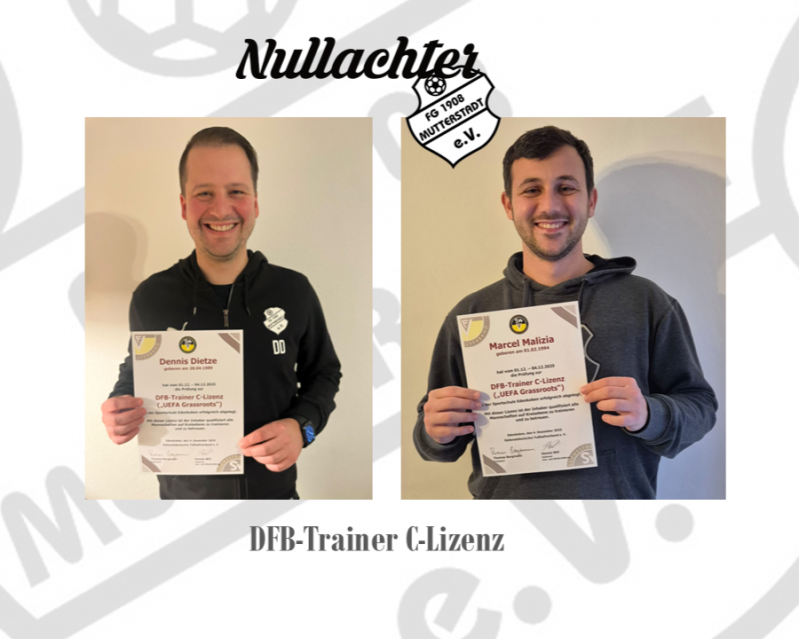 Dennis Dietze und Marcel Malizia, hauptverantwortliche Trainer der 1b der FG 08 Mutterstadt, die in dieser Saison in der A-Klasse Rhein-Mittelhaardt  spielen, haben Ihre  DFB Trainer-C-Lizenz-Prüfung erfolgreich abgelegt. Dennis und Marcel sind seit vielen Jahren ein Teil der Nullachter Familie. Die FG 08 Mutterstadt gratuliert sehr herzlich zur bestandenen Prüfung.
